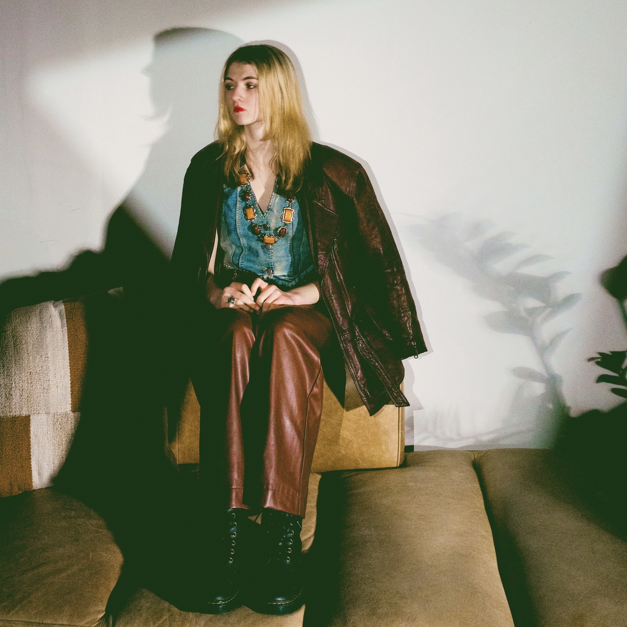 The cover art alone tells you everything and nothing: a woman perched at the edge of a tobacco-coloured couch, leather jacket draped like armour she's decided not to wear, red lips set in a expression that hovers perfectly between contemplation and defiance. Shadows thrown across a white wall like accusations. A plant catching the last of the light. It is dressed in the visual language of 1970s European cinema — Rivette, maybe, or early Wenders — and the music, when it arrives, honours that promise completely.